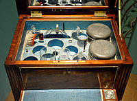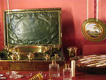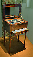 Some services were made with an eye to being compact and easily transportable. The "necessaire" was a term for either a small decorative container for small handy tools such as scissors, tweezers, a spoon, pencil and similar,[43] these also called an etui, or a larger travelling set, originally usually concentrating on small sets of pieces for drinks such as tea and coffee, but later expanded to also include articles for the toilet, writing, sewing, and medicine.[44] The larger cases also became works of art in their own right, with fine inlays in brass. As a frequent traveller, Napoleon commissioned several of these.[45]