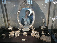Porcelain services were produced from the 18th century onwards. Initially the grandest examples were hardly less expensive than silver. What was probably Madame de Pompadour's Sèvres porcelain service of 1763 is in the Wallace Collection in London. She died the following year and the service was probably incomplete and never delivered. Lacking a mirror, it has three pairs of containers and two brushes.[35] When Maria Feodorovna, wife of the future Tsar Paul I of Russia visited Paris in 1782 under a thin incognito as the "Comtesse du Nord", Queen Marie Antoinette gave her a Sèvres toilet service that cost 75,000 livres, though this included decoration in a complicated technique using gold foil, enamel and jewels.[36]