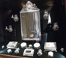 The surviving piece that goes back closest to the origin of the grand toilet set is the mirror from the service of Anne Hyde, wife of the future James II of England, which was made in Paris in 1660–61, and is now in the Louvre. This probably drew from the design of the 40 piece service, now lost, given by Louis XIV to Anne of Austria, which is usually taken to be the first of the grand matching services; this may have been in solid gold.[46]