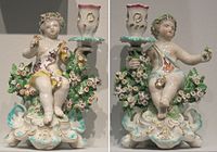 The service usually contained two fairly small candlesticks, allowing the face to be lit from below. There may also be "hand-candles", "chamber candles" or "chamber sticks", short, with a wide saucer-like base and a loop or handle. These were the last lights to be put out at night, and were carried in the hand.[8] Candlestick makers (who always used casting) were treated as a speciality within silversmithing, and the candlesticks may be made by different workshops from the other pieces, as may any snuffers, also regarded as a speciality.[9]