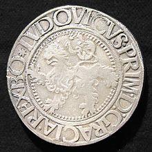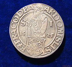 Tolar (German: Thaler) or Jáchymovský tolar is the Czech name for the silver coin mined in Kingdom of Bohemia from 1519 until 1672 in Jáchymov (German: Joachimsthal). On obverse of the coin is depicted Saint Joachim with coat-of-arms of the noble family Schlik, who founded the mint in Ore mountains, with titles of brothers Schlicks in inscription:"STEPHANI:ET:FRATRVM: COMITVM:DE:BASSANO" (without abbreviations). On reverse side is depicted the crowned Bohemian lion with title of the Bohemian King Louis of Jagiellonian dynasty: (without abbreviations):"LVDOVICVS DEI GRACIA REX BOHEMIAE".