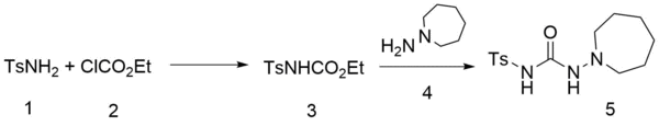 para-Toluenesulfonamide is converted to its carbamate with ethyl chloroformate in the presence of a base. Heating that intermediate with 1-amino-azepane leads to the displacement of the ethoxy group and the formation of tolazemide:[1]
