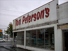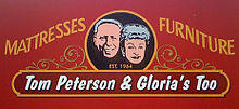 Other Peterson giveaways included hats, T-shirts, cups and coloring books.[14][17] Peterson also turned a bus into a trolley that traveled a circuit around his parking lots on 82nd and Foster.[14] To mark the tenth anniversary of Tom Peterson & Gloria's Too! and the couple's fiftieth wedding anniversary in September 2002, Peterson offered customers coffee mugs with photos of Tom and Gloria, fifty years ago and present day.[13]