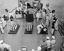 Two Unknowns from World War II, one from the European Theater and one from the Pacific Theater, were placed in identical caskets and taken aboard USS Canberra, a guided-missile cruiser resting off the Virginia Capes, and placed on either side of the Korean unknown. Navy Hospital Corpsman 1st Class William R. Charette, then the U.S. Navy's only active-duty Medal of Honor recipient who was an enlisted man, selected the right-hand casket as the World War II Unknown. The casket of the remaining WWII unknown received a solemn burial at sea.[15]