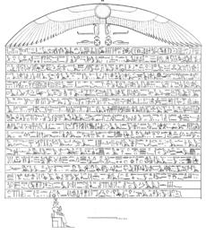The Tombos Stela is an ancient Egyptian rock inscription found in the area of Tombos (Nubia), dated to Year 2 of Pharaoh Thutmose I. It attests to his military campaign into Nubia around the area of the 3rd cataract of the Nile. It was discovered around 1829, on a large boulder in Tombos, Nubia on the east bank of the Nile.[1] Thutmose is known to have expanded Egypt’s borders throughout his reign, not only in Nubia, but also by campaigns in the Syria-Palestine area. During the Middle Kingdom, pharaohs such as Mentuhotep II had already expanded into Nubia.[2] However, scholars argue that the Tombos stela is evidence of farther expansion by Thutmose into Nubia than previous kings.