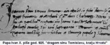 Tomislav became King of Croatia by the year 925.[12] He was the first Croatian ruler whom the Papal chancellery honoured with the title "king".[13] It is generally said that Tomislav was crowned in 924 or 925, but is not known when, where, or by whom he was crowned.[14] The letters in which Tomislav was called a king were preserved in a version of Thomas the Archdeacon's History of Salona.[15] In a note preceding the text of the Council conclusions in Split in 925 it is written that Tomislav is the king "in the province of the Croats and in the Dalmatian regions" (in prouintia Croatorum et Dalmatiarum finibus Tamisclao rege). In the 12th canon of the Council conclusions in 925 the ruler of the Croats is called "king" (rex et proceres Chroatorum),[16] while in a letter sent by Pope John X Tomislav is named "King of the Croats" (Tamisclao, regi Crouatorum).[17] Although there are no inscriptions of Tomislav to confirm the title, later inscriptions and charters confirm that his 10th century successors called themselves "kings".[15]
