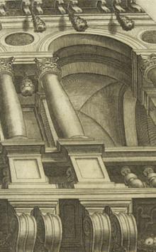 Laureti's perspective design for a portion of an illusionistic ceiling, seen as di sotto in su or 'from below to above', was engraved for Giacomo Barozzi da Vignola's, Le due regole della prospettiva pratica., 1583 (illustration, right).[5]