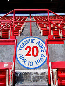 Agee got his first career multi-home run game in the third game of the 1969 season,[9] against the Montreal Expos, one of which went halfway up in section 48 of the left field upper deck at Shea Stadium, a feat that was never matched. Expos right fielder Mack Jones said the ball was still rising when it came into contact with the stands. To commemorate the home run, there was a painted sign in that section of the stadium with Agee's name and uniform number and the date. He also had his first four-hit game on May 2 (four for four with a walk and a home run).[10]