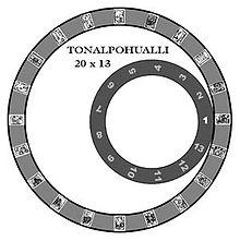 The tōnalpōhualli (Nahuatl pronunciation: [toːnaɬpoːˈwalːi]), meaning "count of days" in Nahuatl, is an Aztec version of the 260-day calendar in use in pre-Columbian Mesoamerica. This calendar is neither solar nor lunar, but rather consists of 20 (veintenas), 13-day (trecenas) periods. Each trecena is ruled by a different deity.
