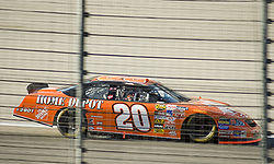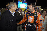 Following his win in the Pepsi 400, Stewart began climbing the fence separating the fans from the race track after each victory, borrowing IndyCar Series driver Hélio Castroneves' trademark move.[16] After winning the 2009 All-Star race, Stewart was quoted as saying "I'm too damn fat to be climbing fences," and recently purchased $17,000 worth of exercise equipment to remedy the problem. It also led to sponsor The Home Depot cashing in on Stewart's success with some promotions reminiscent of Stewart's Eldora Speedway drivers. After his second full climb of the fence in Loudon, N.H., they ran a discount on ladders and fencing at the stores with a campaign named, "Hey Tony, we've got ladders", where anyone who presented the advertisement in national newspapers in their stores earned the discount. After his victory in Indianapolis, The Home Depot presented fans who presented the advertisement of his Allstate 400 win with a discount on purchasing bricks. He mentioned in a press release from his sponsor, "I plan to keep winning races and helping to drive down the cost of home improvement for The Home Depot customers."