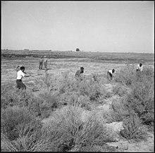 Some internees were permitted to leave the camp to find employment. In 1942, internees were able to get permission to leave the camp for employment in nearby Delta, where they filled labor shortages caused by the draft, mostly in agricultural labor.[12]:28–29 In 1943 over 500 internees obtained seasonal agricultural work outside the camp, with another 130 working in domestic and industrial jobs.[12]:30 Polling showed that a majority of Utahns supported this policy.[25] One teacher at the camp art school, Chiura Obata, was allowed to leave Topaz to run classes at nearby universities and churches.[26]