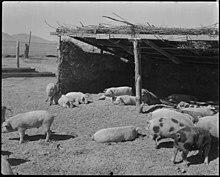 The camp was designed to be self-sufficient, and the majority of land within the camp was devoted to farming. Topaz inmates raised cattle, pigs, and chickens in addition to feed crops and vegetables. The vegetables were high-quality and won awards at the Millard County Fair. Due to harsh weather, poor soil, and short growing conditions, the camp was not able to supply all of its animal feed.[22]