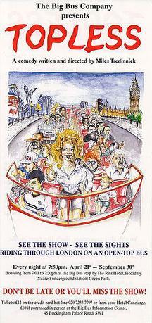 Topless is a one-woman stage play by Miles Tredinnick. It is set on an open-top sightseeing bus and features tour guide Sandie revealing her personal life whilst pointing out the London sights. The play, produced by The Big Bus Company, ran for two seasons in London, firstly in 1999 (directed by Martin Bailey) and then in 2000 (directed by Miles Tredinnick). The role of Sandie was played by three actresses: Rachael Carter, Alexandra Moses and Serena Hanson. Although the play was written to be performed in theatres, the original production was actually performed on the open-top of a double-decker bus driving around the streets of London.