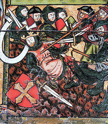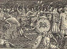 According to Snorri Sturluson's Heimskringla, when Olaf returned to Norway in the summer of 1030, Thorir was among those rallying against him. He and his men led the line against the king's army at the Battle of Stiklestad. The battle site was Stiklestad, a farm in the lower part of the valley of Verdal, 80 kilometres (50 mi) north of the city of Trondheim.. According to saga sources, Thorir was among those who gave Olaf his lethal wounds, together with Kalv Arnesson and Thorstein Knarresmed from Rovde in Sunnmøre.[6] While earlier reports do not name the man who actually killed the king, the Heimskringla specifies Thorir, using a spear tipped with the javelin point that killed his nephew to thrust up below the king's mail shirt and into his abdomen.[1]