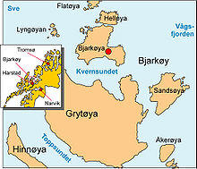 The Tore Hund Monument, by Norwegian artist Svein Haavardsholm, was erected in 1980 beside the road to the church on Bjarkøy. The memorial honors both Thorir Hund and the Bjarkøy clan, who had their seat on Bjarkøy.