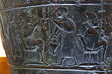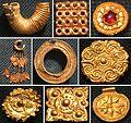 Toreutics claims great antiquity.[5] It was practised in the Bronze Age and was well established centuries before the shaft graves.[6] Toureutic items of special quality from the Iron Age are the Certosa situla from Italy and from Slovenia the Vače situla and the Vače belt-plate. Toreutics flourished to an unusual degree among the peoples of Asia Minor, Assyria, Babylon, and passed from thence to ancient Persia.[7] One spectacular example of the direct influence of Persia in toreutics is believed to be the Treasure of Nagyszentmiklós found in Transylvania in 1799, and considered to be work of Old Bulgarian[8] gold smiths. It consists of 23 vessels and has been attributed to Attila's Huns,[9] the Avars[10] and Pechenegs. The majority of scholars however, consider it Bulgarian (Proto-Bulgarians,[11] Bulgars), because of its runic inscriptions.[12]