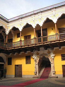 Apart from carved columns, the palace is distinguished by two finely worked balconies in dark wood. These balconies (or miradors) adapt the European architecture to vernacular Peruvian tradition. The interiors feature Sevillian azulejos, plasterwork, wooden columns, lobed Mudéjar arches and soaring coffered ceilings. It is considered to have a true "Limeño" architectural originality, harmoniously combining Andalusian, Mudéjar and Criollo features.