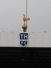 Since the 1921 FA Cup Final the Tottenham Hotspur crest has featured a cockerel. Harry Hotspur, after whom the club is named, was said to have been given the nickname Hotspur as he dug in his spurs to make his horse go faster as he charged in battles,[99] and spurs are also associated with fighting cocks.[100] The club used spurs as a symbol in 1900, which then evolved into a fighting cock.[99] A former player named William James Scott made a bronze cast of a cockerel standing on a football at a cost of £35 (equivalent to £3,680 in 2019), and this 9-foot-6-inch (2.90 m) figure was then placed on top of the West Stand the end of the 1909–10 season.[99] Since then the cockerel and ball emblem has become a part of the club's identity.[101] The club badge on the shirt used in 1921 featured a cockerel within a shield, but it was changed to a cockerel sitting on a ball in the late 1960s.[100]