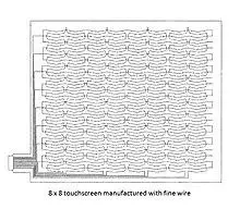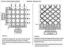Some modern PCT touch screens are composed of thousands of discrete keys,[53] but most PCT touch screens are made of an x/y matrix of rows and columns of conductive material, layered on sheets of glass. This can be done either by etching a single conductive layer to form a grid pattern of electrodes, by etching two separate, perpendicular layers of conductive material with parallel lines or tracks to form a grid, or by forming an x/y grid of fine, insulation coated wires in a single layer . The number of fingers that can be detected simultaneously is determined by the number of cross-over points (x * y) . However, the number of cross-over points can be almost doubled by using a diagonal lattice layout, where, instead of x elements only ever crossing y elements, each conductive element crosses every other element .[54]