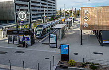 Since April 2015, the tram line T2 connects Toulouse with the airport every 15 minutes.[24] The tram connects with metro ligne A at Arènes and metro ligne B at Palais de Justice. It takes about 35 minutes with a change to go to the town center by tram.