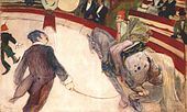 After the death of his brother, Toulouse-Lautrec's parents separated and a nanny eventually took care of him.[7] At the age of eight, Toulouse-Lautrec went to live with his mother in Paris, where he drew sketches and caricatures in his exercise workbooks. The family quickly realized that his talents lay in drawing and painting. A friend of his father, René Princeteau, sometimes visited to give informal lessons. Some of Toulouse-Lautrec's early paintings are of horses, a specialty of Princeteau, and a subject Lautrec revisited in his "Circus Paintings".[7][8]