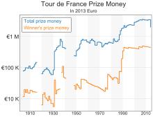 Prize money has always been awarded. From 20,000 francs the first year,[107] prize money has increased each year, although from 1976 to 1987 the first prize was an apartment offered by a race sponsor. The first prize in 1988 was a car, a studio-apartment, a work of art, and 500,000 francs in cash. Prizes only in cash returned in 1990.[108]