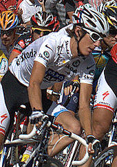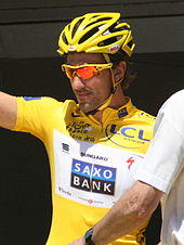 There are usually between 20 and 22 teams, with eight riders in each. All of the stages are timed to the finish; the riders' times are compounded with their previous stage times.[1] The rider with the lowest cumulative finishing times is the leader of the race and wears the yellow jersey.[1][13] While the general classification garners the most attention, there are other contests held within the Tour: the points classification for the sprinters, the mountains classification for the climbers, young rider classification for riders under the age of 26, and the team classification, based on the first three finishers from each team on each stage.[1] Achieving a stage win also provides prestige, often accomplished by a team's sprint specialist or a rider taking part in a breakaway.