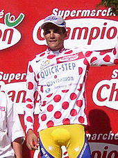 The classification awarded no jersey to the leader until the 1975 Tour de France, when the organizers decided to award a distinctive white jersey with red dots to the leader.[90][92] The climbers' jersey is worn by the rider who, at the start of each stage, has the largest number of climbing points.[91] If a rider leads two or more of classifications, the climbers' jersey is worn by the rider in second, or third, place in that contest. At the end of the Tour, the rider holding the most climbing points wins the classification. Some riders may race with the aim of winning this particular competition, while others who gain points early on may shift their focus to the classification during the race. The Tour has five categories for ranking the mountains the race covers. The scale ranges from category 4, the easiest, to hors catégorie, the hardest. During his career Richard Virenque won the mountains classification a record seven times.