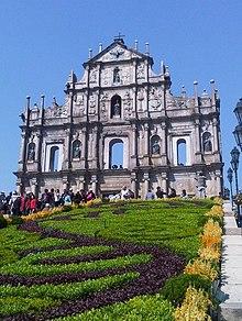 Considered by many as "the most treasured icon in Macau",[1] the Ruins of Saint Paul's is located in Central Macau Peninsula. This tourism sight is the remains of an early-17th-century Jesuit church completed in 1602 by early Japanese Christian craftspeople and Chinese craftspeople, and originally designed by an Italian Jesuit. A fire erupted in the kitchen of the barracks in 1835, destroying everything except for what can still be seen today. Atop of remaining structure is a dove, which symbolises the Holy Spirit, encompassed by stone carvings of the moon, stars and sun.[1]
