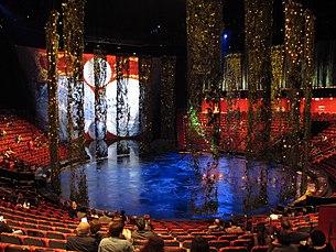 The House of Dancing Water is dubbed "Macau's most expensive show", consisting of "water stunts, acrobatics, aerial arts and theater".[6] US$250 million was invested into the production of this show, which claims to appeal to the Chinese market as a "modern East-meets-West fable".[6] The purpose-built theatre for this production is located within the City of Dreams. Tourists can expect to pay anywhere from HK$478 - HK$1,498 for tickets.[7]