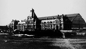 Tournai station (French: Gare du Tournai, Dutch: Station Doornik), is a railway station in Tournai, Belgium, situated on line 94. The first train arrived there on 24 January 1842. A first neo-classical stone building dating from the 1840s was later dismantled and replaced to serve as the railway station of the town of Leuze-en-Hainaut. The current station building was designed by Henri Beyaert and erected between 1874–1879. The monumental building originally included a glass and iron construction covering the platforms and rails, and a "gare des marchandises" located in a separate building conceived in the form of a late-medieval Flemish cloth-hall. The buildings were severely damaged during World War II. The structure covering the platforms and rails was demolished and replaced by simple awnings covering the platforms.