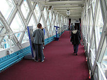 The high-level open air walkways between the towers gained a reputation as a haunt for prostitutes and pickpockets; as they were only accessible by stairs they were seldom used by regular pedestrians, and were closed in 1910.[15][16] The walkway reopened in 1982 as part of the Tower Bridge Exhibition.[15][17]