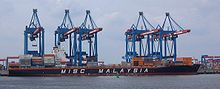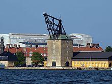 Unlike construction cranes where the work speed was determined by the relatively slow progress of the masons, harbor cranes usually featured double treadwheels to speed up loading. The two treadwheels whose diameter is estimated to be 4 m or larger were attached to each side of the axle and rotated together.[19] Their capacity was 2–3 tons, which apparently corresponded to the customary size of marine cargo.[19] Today, according to one survey, fifteen treadwheel harbor cranes from pre-industrial times are still extant throughout Europe.[34] Some harbour cranes were specialised at mounting masts to newly built sailing ships, such as in Gdańsk, Cologne and Bremen.[15] Beside these stationary cranes, floating cranes, which could be flexibly deployed in the whole port basin came into use by the 14th century.[15]