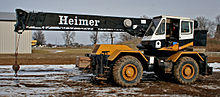 A rough terrain crane has a boom mounted on an undercarriage atop four rubber tires that is designed for off-road pick-and-carry operations. Outriggers are used to level and stabilize the crane for hoisting.[47]