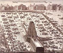A lifting tower similar to that of the ancient Romans was used to great effect by the Renaissance architect Domenico Fontana in 1586 to relocate the 361 t heavy Vatican obelisk in Rome.[35] From his report, it becomes obvious that the coordination of the lift between the various pulling teams required a considerable amount of concentration and discipline, since, if the force was not applied evenly, the excessive stress on the ropes would make them rupture.[36]