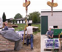 In contrast to modern cranes, medieval cranes and hoists — much like their counterparts in Greece and Rome[28] — were primarily capable of a vertical lift, and not used to move loads for a considerable distance horizontally as well.[25] Accordingly, lifting work was organized at the workplace in a different way than today. In building construction, for example, it is assumed that the crane lifted the stone blocks either from the bottom directly into place,[25] or from a place opposite the centre of the wall from where it could deliver the blocks for two teams working at each end of the wall.[28] Additionally, the crane master who usually gave orders at the treadwheel workers from outside the crane was able to manipulate the movement laterally by a small rope attached to the load.[29] Slewing cranes which allowed a rotation of the load and were thus particularly suited for dockside work appeared as early as 1340.[30] While ashlar blocks were directly lifted by sling, lewis or devil's clamp (German Teufelskralle), other objects were placed before in containers like pallets, baskets, wooden boxes or barrels.[31]