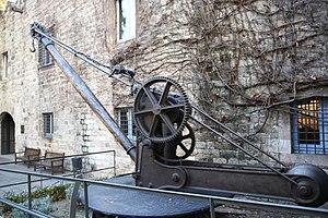 Less frequently, medieval illuminations also show cranes mounted on the outside of walls with the stand of the machine secured to putlogs.[27]