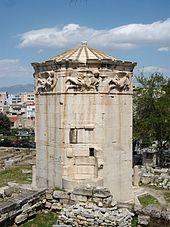 The Tower of the Winds or the Horologion of Andronikos Kyrrhestes is an octagonal Pentelic marble clocktower in the Roman Agora in Athens that functioned as a horologion or "timepiece". It is considered the world's first meteorological station. Unofficially, the monument is also called Aerides (Greek: Αέρηδες), which means Winds. The structure features a combination of sundials, a water clock, and a wind vane.[1] It was supposedly built by Andronicus of Cyrrhus around 50 BC, but according to other sources, might have been constructed in the 2nd century BC before the rest of the forum. In summer of 2014, the Athens Ephorate of Antiquities began cleaning and conserving the structure; restoration work was completed in August 2016.[2]