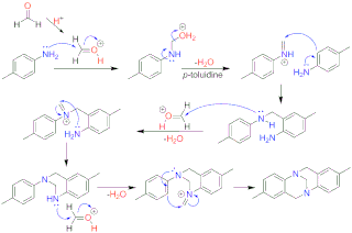 Tröger's base is of historic interest as was first synthesised in 1887[1] from p-toluidine and formaldehyde in acid solution by Julius Tröger.[1] It can also be prepared with dimethyl sulfoxide and hydrochloric acid[19] or hexamethylene tetraamine (HMTA) as formaldehyde replacement.[20]