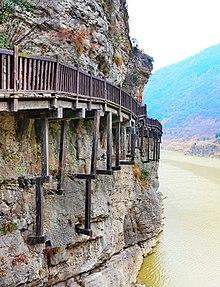 The Shudao (Chinese: 蜀道; pinyin: Shǔdào), or the "Road(s) to Shu", is a system of mountain roads linking the Chinese province of Shaanxi with Sichuan (Shu), built and maintained since the 4th century BC. Technical highlights were the gallery roads, consisting of wooden planks erected on wooden or stone beams slotted into holes cut into the sides of cliffs. The roads join three adjacent basins separated and surrounded by high mountains. Like many ancient road systems, the Shu Roads formed a network of major and minor roads with different roads being used at different historical times. However, a number of roads are commonly identified as the main routes.[10]