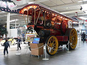 A particularly distinctive form of road locomotive was the showman's engine. These were operated by travelling showmen both to tow fairground equipment and to power it when set up, either directly or by running a generator. These could be highly decorated and formed part of the spectacle of the fair. Some were fitted with a small crane that could be used when assembling the ride.