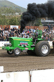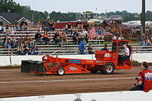 Antique tractor pulling is how tractor pulling first got started. As early as 1929, farmers began attaching their tractors to drags, and dragging it down a field to see who could pull it the furthest.[1] People who were event organizers at Bowling Green, Missouri and Vaughansville, Ohio found out farmers were doing this and that it drew spectators.[1] By 1950, county fairs across the country started featuring tractor pulls.[1] Spectators found it fascinating to see machines that would “Pull on Sunday, plow on Monday”.[1] At first competitors would use a ‘Human Drag’, meaning a drag that was weighted by humans, different people would be added as the tractor made it down the track. However, organizers began to look at different ways to add weight to the drag, as spectators walking on the drag while moving proved to be a hazard.[1] In the late 60s, a weight-exchanging drag was created, the drag that was created was basically a flatbed truck trailer with wheels near the back and a drag at the front.[1] A mass that is moveable of up to 65,000 pounds or 29,000 kilograms, the mass starts at the back of the sled, slowly working its way up to the top as the drag moves down the track.[1]