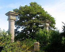 The north-west entrance to the estate is through two tall mid-19th century gate piers, which are Grade II listed.[12] These are constructed principally of rubble, but dressed with bath stone ashlar which frames heraldry peculiar to the Davy family. The piers are crowned by double cross finials.[3] These piers clearly reflect the unusual design of the large buttresses on the south face of the mansion. Opposite the entrance piers, and deliberately complementing them, is a three-story farmhouse built in about 1845; this has been given heavy Grecian detailing, a blind pediment and a classical balustrade to its precincts.[3] The southwest entrance is also through high gate piers, but these are cylindrical and of a simpler, chaste design than those of the northeast entrance.[3]