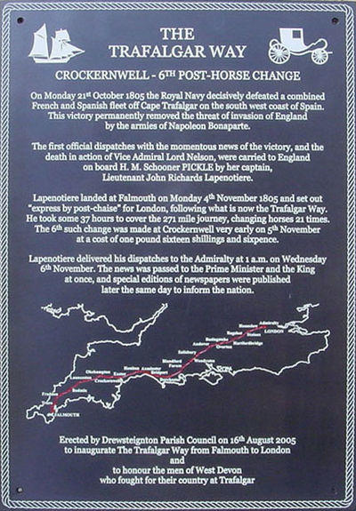 A series of commemorative plaques mark the route,[1][2][3] giving details of his journey and commemorating local people who fought with Nelson at Trafalgar. They can be seen at Falmouth, Penryn, Perranwell, Truro, Fraddon, Bodmin, Launceston, Lifton, Bridestowe, Okehampton, Sticklepath, Crockernwell, Tedburn St Mary, Nadderwater, Exeter, Clyst Honiton, Honiton, Wilmington, Kilmington, Axminster, Bridport, Dorchester, Blandford Forum, Woodyates, Salisbury, Andover, Overton, Basingstoke, Hartfordbridge, Camberley, Bagshot, Egham, Staines, Hounslow, Brentford & Chiswick, Hammersmith, Kensington, Canada House and finally on the Old Admiralty Building in Whitehall.