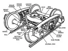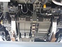 A bogie (/ˈboʊɡi/ BOH-ghee) is a wheeled wagon or trolley. In mechanics terms, a bogie is a chassis or framework carrying wheels, attached to a vehicle. It can be fixed in place, as on a cargo truck, mounted on a swivel, as on a railway carriage or locomotive, or sprung as in the suspension of a caterpillar tracked vehicle. Usually, two bogies are fitted to each carriage, wagon or locomotive, one at each end. An alternate configuration, which is often used in articulated vehicles, places the bogies (often Jacobs bogies) under the connection between the carriages or wagons. Most bogies have two axles, as this is the simplest design, but some cars designed for extremely heavy loads have been built with up to five axles per bogie. Heavy-duty cars may have more than two bogies using span bolsters to equalize the load and connect the bogies to the cars. Usually, the train floor is at a level above the bogies, but the floor of the car may be lower between bogies, such as for a double decker train to increase interior space while staying within height restrictions, or in easy-access, stepless-entry, low-floor trains.