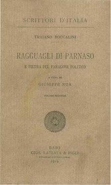 One or more of the preceding sentences incorporates text from a publication now in the public domain: Chisholm, Hugh, ed. (1911). "Boccalini, Trajano". Encyclopædia Britannica. 4 (11th ed.). Cambridge University Press. p. 105.