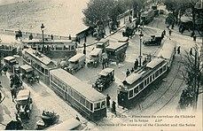 From 1855 to 1938, Paris was served by an extensive tramway network, predating the metro by nearly a half-century.[4] In 1925 the network had a 1,111 km (690 mi) length, with 122 lines. In the 1930s, the oil and automobile industry lobbies put pressure on the Paris Police Prefecture to remove tram tracks and make room for cars.[5] The last of these first generation tram lines inside of Paris, that connected Porte de Saint-Cloud to Porte de Vincennes, was closed in 1937,[6] and the last line in the entire Paris agglomeration, running between Le Raincy and Montfermeil, ended its service on 14 August 1938.[5]