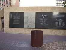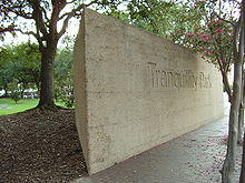 Tranquillity Park is a park in Downtown Houston, Texas, between Walker and Rusk Streets, and west of Smith Street, with the United States federal courts building for the Southern District of Texas on one side and Houston City Hall on the other. It takes its name, notably differing in spelling, from the Sea of Tranquility, where man first landed on the Moon during the Apollo 11 mission on July 20, 1969.[1] First opening to visitors in the summer of 1979, Tranquillity Park was officially dedicated on the tenth anniversary of the historic lunar landing. On bronze plaques placed along the main entrance, the first words transmitted by Neil Armstrong from the Moon, "Houston, Tranquillity Base here. The Eagle has landed," are written in 15 languages.[2] A replica of one of the footprints left on the Moon by Neil Armstrong is also on display inside the park.