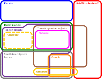 - ^ a b The literature is inconsistent in the use of the phrases "scattered disc" and "Kuiper belt". For some, they are distinct populations; for others, the scattered disk is part of the Kuiper belt, in which case the low-eccentricity population is called the "classical Kuiper belt". Authors may even switch between these two uses in a single publication.[2]