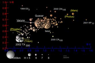 Colour indices are simple measures of the differences in the apparent magnitude of an object seen through blue (B), visible (V), i.e. green-yellow, and red (R) filters. The diagram illustrates known colour indices for all but the biggest objects (in slightly enhanced colour).[15] For reference, two moons: Triton and Phoebe, the centaur Pholus and the planet Mars are plotted (yellow labels, size not to scale). Correlations between the colours and the orbital characteristics have been studied, to confirm theories of different origin of the different dynamic classes: